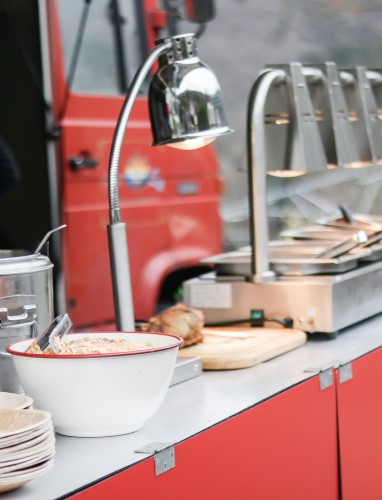 Unsere Fahrzeuge sind mit einer modernen Profi-Küche ausgestattet, in der wir Ihre Menüwünsche umsetzen können.